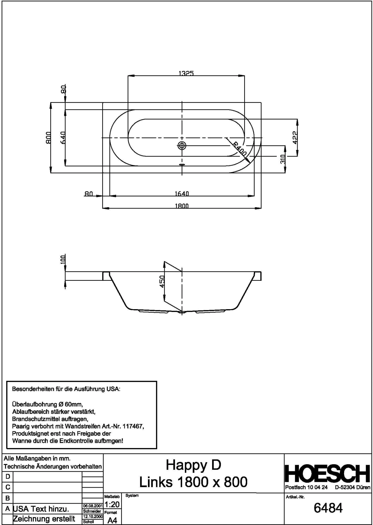 Hoesch Happy D. Eck Badewanne 6484.010 180x80cm, Weiss, Einbauversion, Ausführung Links