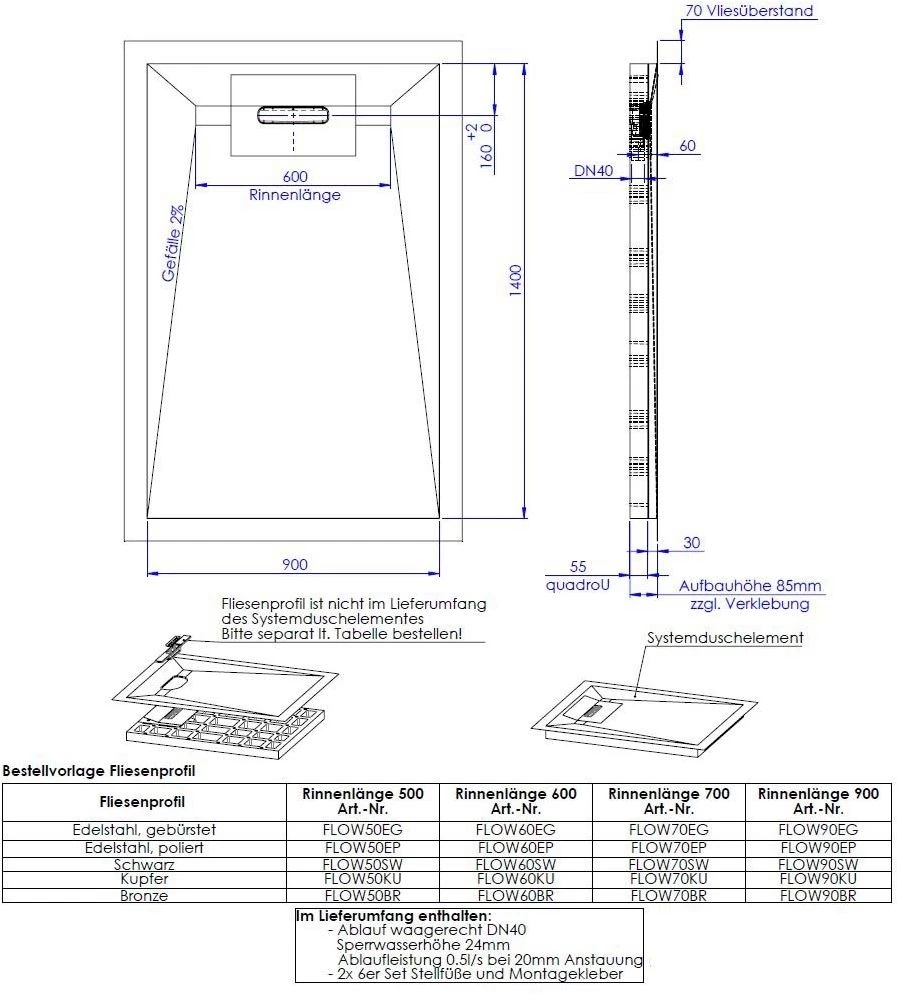 Schedel Line Flow Duschelement LI1KF609014 90 X 140 Cm, Vierseitiges Gefälle