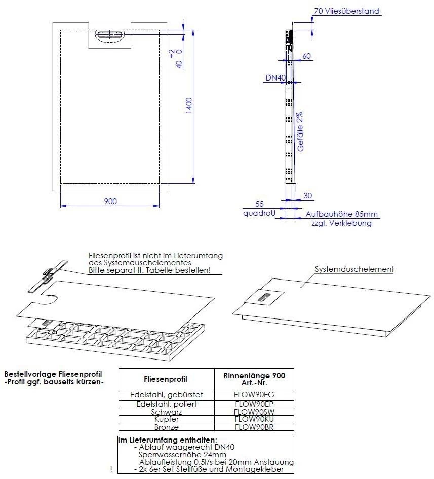 Schedel Line Flow Duschelement LI2KF609014 90 X 140 Cm, Einseitiges Gefälle