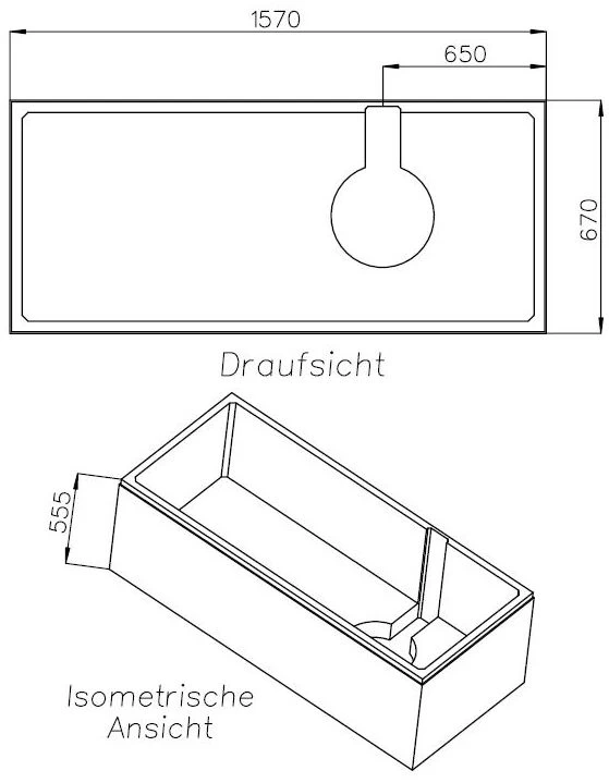 - 160x70cm, Überlauf hinten, Höhe 55,5cm